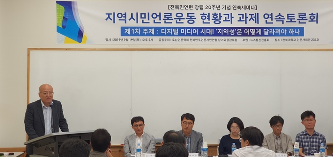 호남언론학회, 전북민주언론시민연합, 참여와공감포럼이 공동 주최하고 뉴스통신진흥회가 후원하는 ‘지역시민언론운동 현황과 과제’ 세미나가 지난 19일 전북대학교에서 열렸다. 지역시민언론운동의 성과를 짚고 변화한 미디어 환경에서 나아갈 방향을 모색하는 해당 세미나는 10월18일, 11월15일, 12월14일까지 총 4회에 걸쳐 진행된다. 사진은 강기석 뉴스통신진흥회 이사장과 패널 등 모습. 뉴스통신진흥회 제공