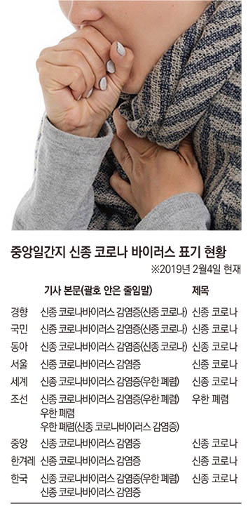 중앙과 동아는 지난 3일부터 ‘우한 폐렴’이라는 용어를 사용하지 않고 있다. 중앙은 ‘우한에서 발생한 신종 코로나바이러스 감염증’으로 수정하고, 줄여 쓸 때는 ‘신종 코로나’로 쓰겠다고 밝혔다. 기사 제목에서도 ‘우한 폐렴’이 사라졌다. 동아일보도 이날부터 ‘신종 코로나바이러스 감염증(신종 코로나)’로 수정해 사용하고 있다.