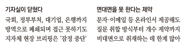공식 브리핑이 진행된다 해도 사무실 방문 취재가 제한되고 오찬 간담회와 미팅이 줄줄이 취소되는 등 비대면 취재 분위기는 점점 더 강화되는 상황이다.