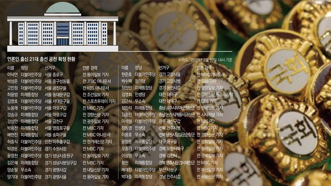 기자협회보는 중앙선거관리위원회가 공개한 21대 국회의원 선거 예비후보자 명부에서 이번 총선에 출마한 언론인을 조사했다. 그 결과 70여명의 언론인 출신 후보들이 총선 무대에 오른 것으로 나타났다. 예비후보로 등록하지 않았지만 이미 전략공천이 됐거나 유력하게 공천 검토 중인 이들도 포함했다.