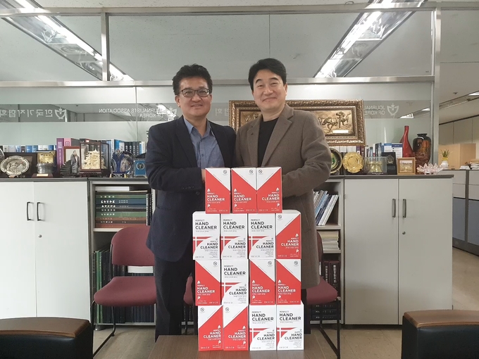 류찬열 아르카 인코퍼레이션 대표이사(사진 오른쪽)는 지난 13일 코로나19 현장을 취재 중인 기자들이 사용할 수 있도록 해달라며 김동훈 한국기자협회장에게 휴대용 손 세정제 4000개를 전달했다.