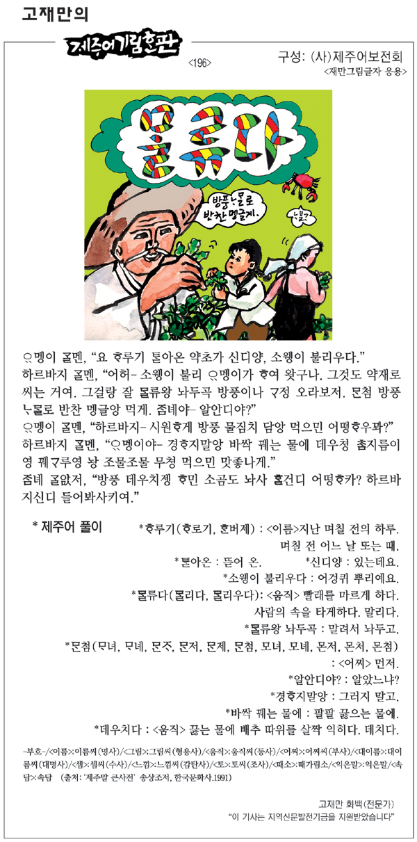 제민일보와 한라일보도 오래 전부터 제주어로 쓰인 칼럼과 만평을 내보내고 있다. 한라일보는 2016년부터 ‘고재만의 제주어기림한판<사진>’이라는 제목으로 고재만 화백의 제주 말 만평을 신문에 싣고 있다. 7일에 한 번 서는 장처럼 매주 한 번 제주 말을 골라 크게 한 판 벌려놓겠다는 의미다. 제민일보도 지난 2010년부터 제주어로 쓰인 칼럼을 신문에 내고 있다. 직전엔 ‘제주어의 세상여행’이었고 최근엔 ‘제주어는 보물이우다’로 바뀌는 등 칼럼 이름에 주기적으로 변화를 주는 모양새다.
