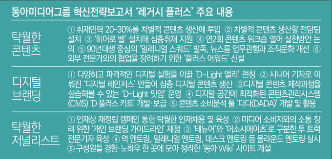 보고서는 콘텐츠와 디지털 브랜딩, 저널리스트 차원에서 뉴스룸이 어떻게 변화해야 하는지를 실행과제 형식으로 담고 있다. △불편부당 시시비비의 정신 △콘텐츠 역량 △동아 저널리스트 DNA 등의 유산은 계승·발전시켜 나가되 △공급자 중심의 제작 관행 △콘텐츠 포장과 유통의 미흡함 △겸양을 미덕으로 여기는 조직문화는 개선해야 한다고 보고서는 말하고 있다.