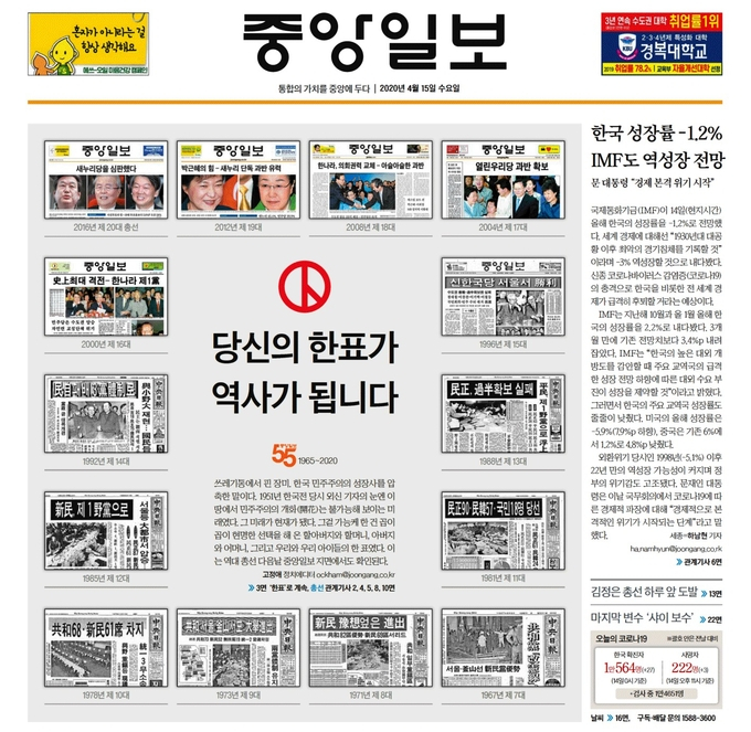 총선 당일인 지난 15일 중앙일보는 신문 첫 장에 역대 총선 다음날 중앙일보의 1면 지면 14개(7~20대 총선)를 담는 편집을 선보였다. <당신의 한 표가 역사가 됩니다>라는 제목처럼, 그간 지면에 기록된 선거의 역사를 보여줌으로써 투표 독려 메시지를 강렬히 전하려는 시도였다. 공교롭게도 이날 한국일보와 서울신문도 유사한 지면을 선보였다. 한국은 <어떤 세상을 꿈꾸나요, 나의 한 표가 미래입니다>라는 제하 최근 네 번의 총선 다음날 자사 첫 지면을 1면에 담았고, 서울은 제헌국회부터 20대까지 각 국회를 상징할 만한 사진을 선정해 배치하고 가운데 <21대 어떤 국회를 원하십니까>란 제목을 달았다.