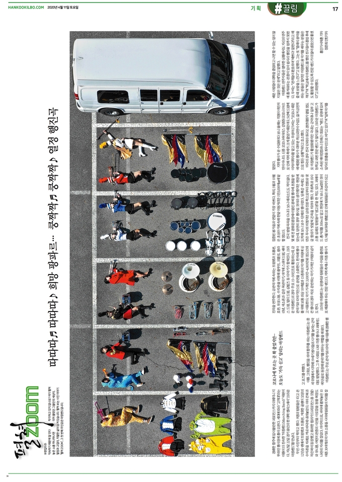 신문사들에서 이런 시도는 수년 째 진행돼 왔다. ‘비주얼’이 강조되는 시대인 만큼 눈길을 끌만한 이미지를 사용, 과감한 편집을 하는 경우가 대표적이다. 실제 한국은 지난 11일자 신문 17면에 ‘펼쳐Zoom’이란 코너를 선보이며 고적대의 ‘테트리스 챌린지’ 사진을 지면 통째로, 가로 사진을 세로로 써 편집하는 시도를 했다. 앞서 중앙일보의 토요판을 담당하는 중앙선데이가 ‘포토뉴스(와이드샷)’ 코너를 통해 같은 형식을 선보인 바 있다. 경향신문 <매일 김용균이 있었다> 기사도 이 범주에 든다. 디지털이 인터랙티브나 이미지 나열에 기반한 스토리텔링에 강점을 지닌다면 신문은 ‘큰 종이’의 물성에 기초한 ‘한 컷’의 충격이 장점이란 포인트에 착안한 접근이다.
