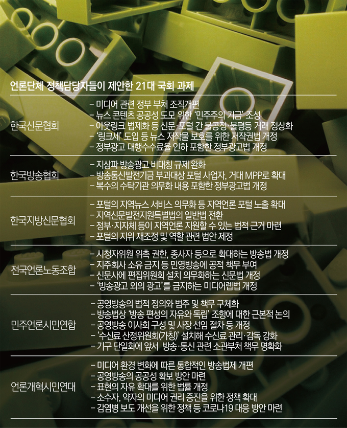 제21대 국회 개원이 한 달 앞으로 다가왔다. 오는 5월30일이면 지난 4·15 총선에서 승리한 당선인들이 국회에 입성해 산적한 민생·개혁 법안 논의를 시작한다. 특히 이번 총선에선 검찰개혁 만큼이나 언론개혁에 대한 요구가 빗발쳐 언론 관련 법안에 대한 대대적 손질이 이뤄질 것으로 예측된다. 20대 국회가 약속했지만 논의조차 하지 않은 언론 과제도 많아 조속한 처리를 요구하는 목소리도 높다. 기자협회보는 21대 국회가 시작하기에 앞서 한국신문협회, 한국방송협회, 한국지방신문협회, 전국언론노동조합, 민주언론시민연합, 언론개혁시민연대 6개 언론 관련 단체와 학회의 정책 담당자에게 요청해 언론계 입법 제안을 한데 모았다. 이들은 밀린 숙제가 많다면서 이번 국회에서라도 이 과제들을 모두 해결해야 한다고 강조했다.