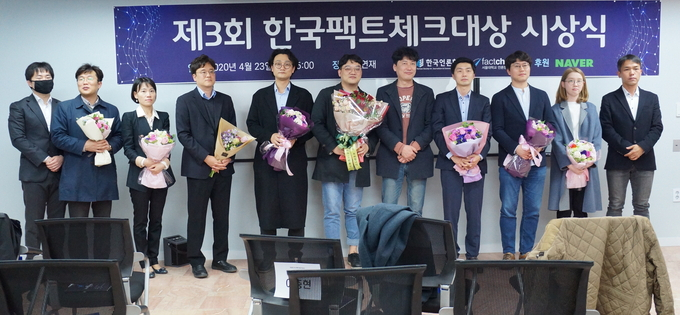 한국언론학회와 SNU팩트체크센터가 공동 제정한 제3회 ‘한국팩트체크대상’ 시상식이 지난 23일 서울 중구 정동 성공회빌딩 상연재에서 열렸다. 이날 시상식에서 SBS ‘사실은’ 팀(박세용·이경원)의 <도쿄올림픽 방사능 논란, 사실은? 팩트체크 연속보도>가 대상을 수상했다. 노컷뉴스(김성기·박기묵·정재림·이충현)의 <요람에서 무덤까지, 2019 대한민국 플라스틱 보고서>, 뉴스타파(김기철·김성수·연다혜)의 <세월호 CCTV 의혹 검증 3부작>, YTN(고한석·이정미·한동오·홍성욱)의 <韓日갈등·역사왜곡 검증보도>가 우수상을 받았다.