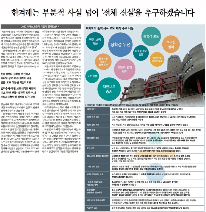 한겨레는 14일 "독자의 신뢰를 높이기 위해 2007년 제정한 '한겨레미디어 취재보도준칙'을 전면 개정했다"며 "법조 보도의 지침이 되는 '범죄 수사 및 재판 취재보도 시행 세칙'도 수정·보완했다. 15일부터 시행에 들어간다"고 알렸다.