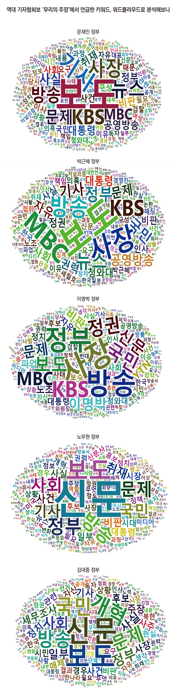 데이터 분석과 시각화는 통계프로그램 R을 활용했다. 한글 자연어 분석 패키지(KoNLP)와 한글형태소 사전(NIADic)을 사용해 각 정부 시기별 우주에서 가장 많이 쓰인 단어를 추출한 뒤 ‘언론(사)’, ‘기자’, ‘우리’ 같이 공통으로 많이 등장하거나 의미 없는 단어들은 제외하고 각 300개를 뽑아 워드클라우드로 만들었다.