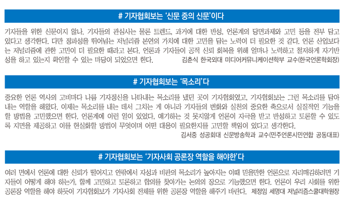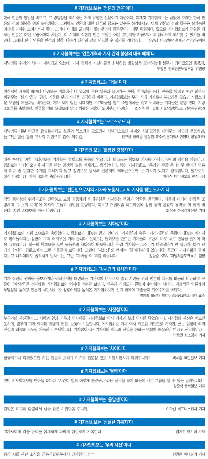 기자협회보 지령 2000호를 맞아 기자협회보를 어떻게 생각, 혹은 평가하는지 각계의 의견을 들었다. 따뜻한 애정과 격려, 그리고 조언이 담긴 메시지까지. 허투루 넘기지 않고 다시 첫걸음을 떼는 마음가짐으로 지령 2000호 그 이후를 준비하려 한다. <편집자 주>