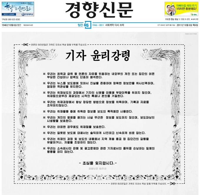 2011년 10월6일 경향신문은 ‘기자 윤리강령’을 1면 전면에 내걸었다. 경향 창간 65주년을 맞아 광고 기획자 이제석씨가 제작한 특별 광고다. 광고 문안으로 쓰인 윤리강령은 절취선에 둘러싸여 있다. 여기에 ‘언론인 여러분들은 가위로 오려서 책상 앞에 부착해 주십시오’라는 문구가 붙었다. 이제석씨는 작품을 설명하면서 “이 구닥다리 문서가, 언론이 세상의 부조리를 바로잡기 이전에 스스로는 과연 얼마나 잘하고 있는가를 묻는 계기가 됐으면 한다”고 했다.