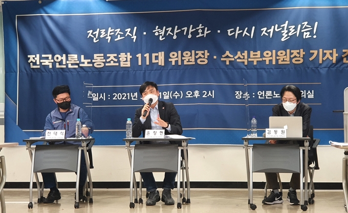 전국언론노동조합 11대 위원장·수석부위원장이 취임 기념 기자간담회를 열고 올해 추진할 주요 사업의 방향성과 언론계 현안에 입장을 밝혔다.