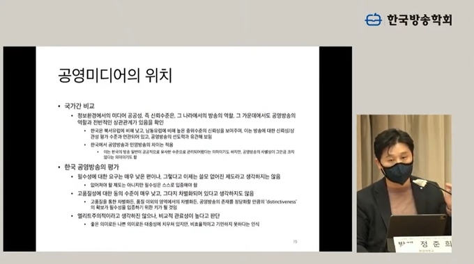 정준희 한양대학교 언론정보대학 겸임교수도 “미디어 전반의 공공성이 재조정되고 실행 주체가 재편되도록 제도 설계가 필요하다”고 강조했다. 주파수나 전달 수단의 공공성보다 누구나 볼 수 있다는 의미에서 미디어의 ‘공연성’ 개념에 초점을 맞춰야 한다는 것이다. 정 교수는 “공공적인 ‘정보’의 생산과 유통에서 무질서를 제어하고 사회적 신뢰수준을 높일 방안이 필요하며 이는 미디어 창구를 막론하고 공통적으로 적용되어야 한다”면서 “유럽연합의 시청각매체법과 유사하게 미디어를 통할하는 신규 법령이 필요하다”고 말했다.