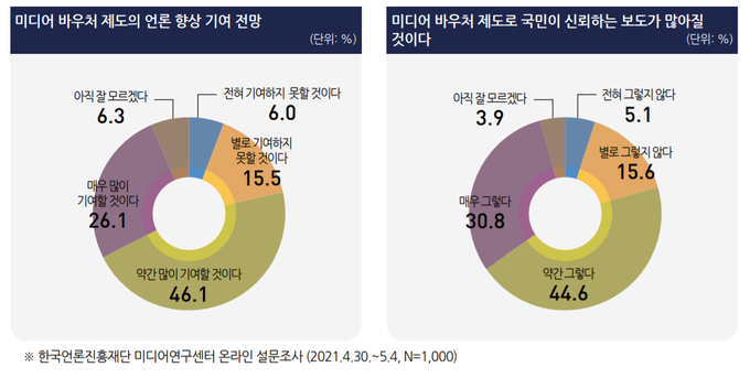 전체 응답자 기준 미디어 바우처 제도가 언론을 향상시키는데 기여할 것이란 긍정적 전망은 72.2%로 나타났다. 바우처 제도로 국민이 신뢰하는 보도가 많아질 것이란 예상도 75.4%였다.