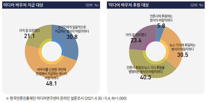 바우처 지급 방식에 대해선 “신청한 국민에 한정해 지급해야 한다”는 응답이 48.1%로, “전 국민에게 일괄적으로 지급해야 한다”는 응답 30.8%보다 높게 나타났다. 다만 “아직 잘 모르겠다”는 응답도 21.1%나 나와 추가 논의 필요성을 시사했다. 바우처 후원대상과 관련해선 “언론사 후원과 뉴스 기사 후원 병행” 40.3%, “뉴스 기사에 후원”이 30.5%였지만, “언론사 후원”은 5.8%에 불과했다.