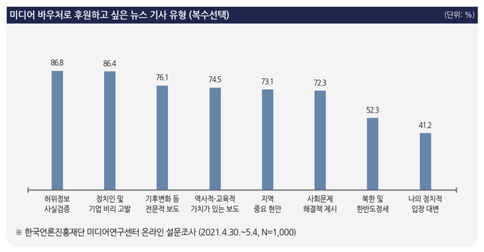 바우처로 후원하고 싶은 뉴스 기사로는 허위정보 사실검증 기사가 86.8%, 정치인 및 기업 비리 고발 기사가 86.4%로 가장 많았다. 기후변화 등 전문적 보도 76.1%, 역사적 교육적 가치가 있는 보도 74.5%, 지역 현안을 다루는 기사 73.1%, 사회문제에 대해 해결책을 제시하는 기사 72.3%였다. “나의 정치적 입장을 대변하는 기사에 후원하겠다”는 응답은 41.2%로 가장 적었다. 언론재단은 “미디어 바우처를 통한 언론 후원이 정치적 양극화를 심화시킬 수 있다는 지적이 있다. 이 조사결과는 그럴 수 있는 가능성을 완전히 배제할 수는 없지만 정치적 양극화가 주된 결과는 아닐 것임을 함의한다”고 했다.