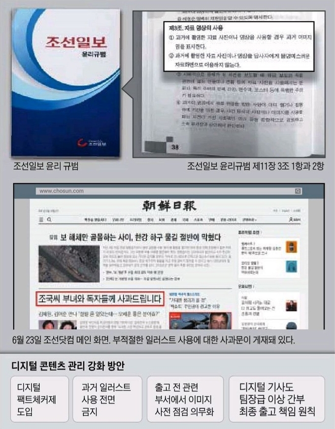 조선일보는 또 디지털 기사에 대한 콘텐츠 관리도 강화하기로 했다. 조선일보는 “지면뿐만 아니라 온라인에 출고되는 기사도 각 부서 팀장급 이상 간부가 최종 출고 책임을 지는 것을 원칙으로 했다”며 “현장에 있는 일선 기자가 송고하는 속보의 경우에도 출고 직후 기사와 이미지 내용의 적정성을 점검하는 시스템을 가동하기로 했다”고 밝혔다.