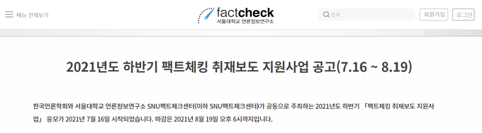 한국언론학회와 서울대 언론정보연구소 산하 SNU팩트체크센터는 ‘2021년도 하반기 팩트체킹 취재보도 지원사업’ 신청 접수를 8월19일 오후 6시까지 받는다. 기획취재 지원사업의 경우 최대 3000만원, 시스템 개발사업은 최대 1억원을 지원한다.