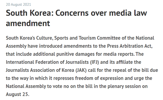 더불어민주당이 밀어붙이는 언론중재법 개정안에 대해 국제기자연맹(IFJ)은 “표현의 자유를 억누르는 이 법안의 폐지를 요구하며 25일 본회의에서 부결될 것을 촉구한다”고 밝혔다.