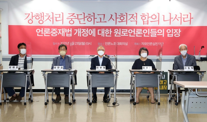 자유언론실천재단은 23일 서울 중구 한국프레스센터 18층 언론노조 회의실에서 기자회견을 열어 ‘언론중재법 개정안 강행 처리를 중단하고 사회적 대화에 나서야 한다’는 원로언론인들의 입장을 밝혔다. 이날 기자회견에는 이부영 자유언론실천재단 이사장, 성한표 조선자유언론수호투쟁위원회(조선투위) 위원장, 유숙열 80년해직언론인협의회 공동대표, 신홍범 조선투위 위원이 참석했다.