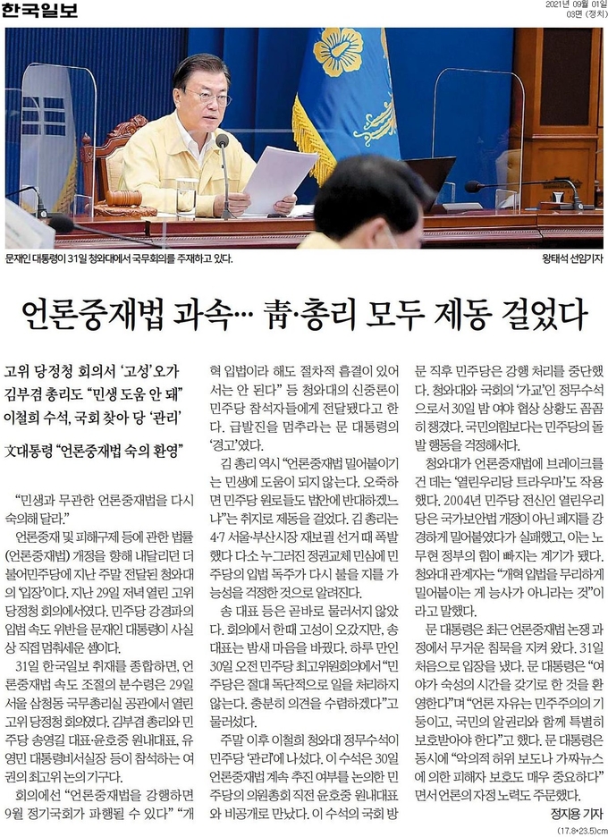 한국일보는 이날 3면 기사 <언론중재법 과속…청·총리 모두 제동 걸었다>에서 “언론중재법 속도 조절의 분수령은 지난 29일 저녁 열린 고위 당정청 회의였다”고 보도했다.