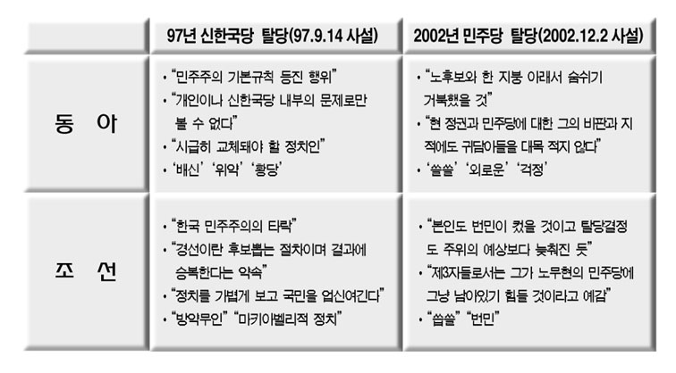 이용성 한서대 신문방송학과 교수는 “97년 탈당과 보도차이는 조선과 동아가 추구하는 방향과 연관되어 생각해야 한다”면서 “조선과 동아는 여전히 이념대결 구도에 대한 미련을 가지고 있음을 알 수 있다”고 말했다.