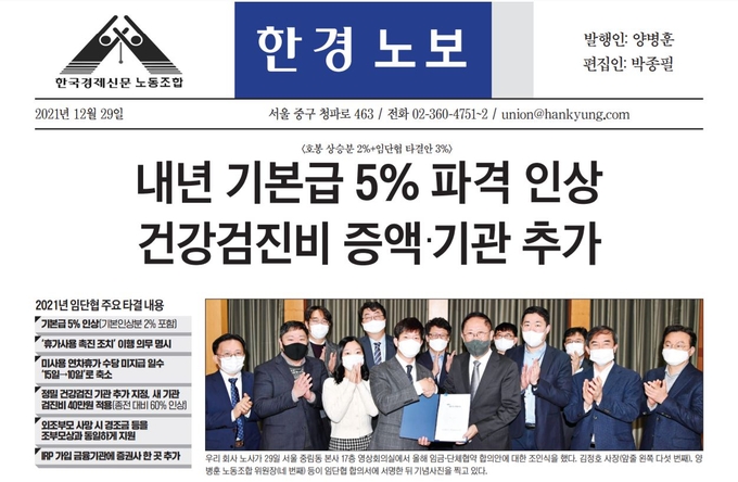 한국경제신문 노사가 기본급 3% 인상과 건강검진비 증액 등을 포함한 2021년 임금·단체협약을 29일 체결했다. 기본급의 경우 호봉 상승분 2%까지 포함하면 내년 인상률은 5%로, 예년에 비해 큰 폭의 인상이다. 한국경제 노조는 “창사 이후 최대치였던 2007년과 같은 인상률”이라며 “직전 10년 평균 인상률(3.6%)보다 1.4%p 높다”고 밝혔다.