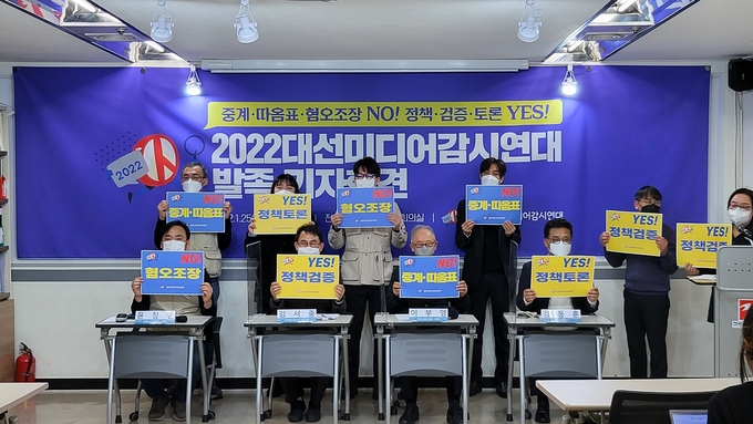 민주언론시민연합, YMCA전국연맹, 한국기자협회, 전국언론노조, 자유언론실천재단, 한국PD연합회 등 24개 단체는 25일 오전 서울 중구 한국프레스센터 전국언론노조 대회의실에서 기자회견을 열고 ‘2022 대선미디어감시연대’ 발족을 선언했다.
