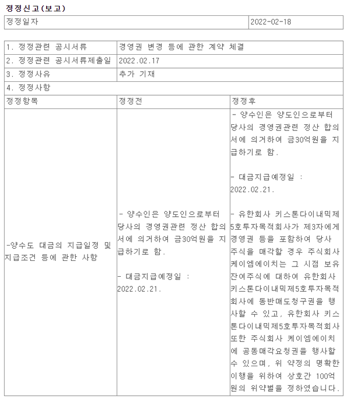 18일 전자공시 ‘경영권 변경 등에 관한 계약 체결’에 따르면 아시아경제 현 최대주주 키스톤은 2대주주이자 이전 최대주주인 KMH로부터 경영권 관련 정산 합의서에 의거, 30억원을 21일 지급하기로 했다. 아울러 키스톤이 제3자에게 경영권 등을 포함해 주식 매각 시 KMH는 보유 잔여주식에 대해 키스톤에 동반매도청구권을 행사할 수 있고, 키스톤 또한 KMH에 공동매각요청권을 행사할 수 있다는 내용을 포함해 상호간 100억원의 위약벌을 정한 약정이행에 합의했다.