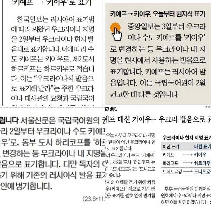 3일 기준 9개 종합 일간지(경향신문, 국민일보, 동아일보, 서울신문, 세계일보, 조선일보, 중앙일보, 한겨레, 한국일보), 지상파 3사, 보도전문채널 2개사, 종합편성채널 4개사 등은 우크라이나 지명을 현지 발음으로 표기하거나, 러시아식 발음을 병기해 쓰고 있다. 기사에 우크라이나 수도를 키예프에서 키이우로, 제 2의 도시인 하리코프를 하르키우로 바꿔 쓰거나, 독자들의 혼동을 막기 위해 ‘키예프(키이우)’, ‘키이우(키예프)’로 괄호 안에 혼용하는 식이다.