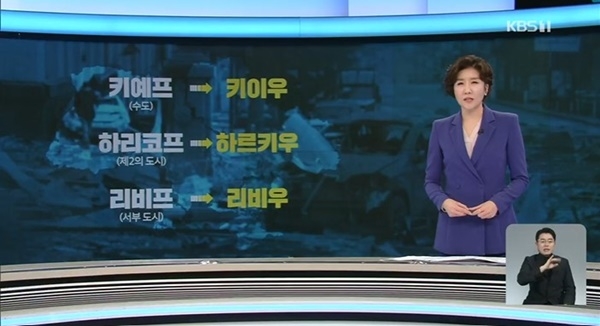 지난 1일 이소정 앵커는 KBS ‘뉴스9’에서 “오늘부터 우크라이나 지명을 러시아어가 아닌 우크라이나어를 기준으로 전해드린다는 점 말씀드린다”며 “대표적으로 수도는 키예프에서 ‘키이우’로, 제 2의 도시 하리코프는 ‘하르키우’로 서부의 리비프는 ‘리비우’로 바꿔 부른다. 외래어는 그 나라 발음에 최대한 가깝게 표기한다는 국립국어원과 KBS 한국어연구부의 자문을 거쳤다”고 전했다.