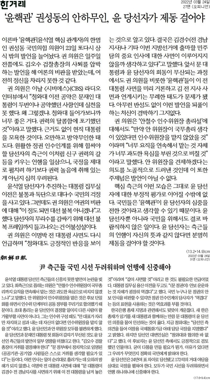 한겨레는 24일자 사설 <‘윤핵관’ 권성동의 안하무인, 윤 당선자가 제동 걸어야>에서 “여전히 정신을 차리지 못한 것 같다”며 권성동 의원을 직격했다.