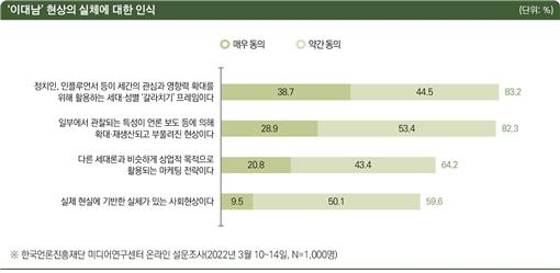 지난 23일 한국언론진흥재단(언론재단) ‘미디어 이슈-이대남 현상에 대한 인식’ 보고서에 따르면 ‘이대남’ 현상의 실체에 대한 인식 조사결과 응답자 83.2%가 “정치인, 인플루언서 등이 세간의 관심과 영향력 확대를 위해 활용하는 세대·성별 갈라치기 프레임”에 대해 가장 높은 동의도를 보인 것으로 나타났다. “일부에서 관찰되는 특성이 언론보도 등에 의해 확대·재생산되고 부풀려진 현상”이란 응답이 82.3%로 뒤를 이었다. 반면 “실제 현실에 기반한 실체가 있는 사회현상”이란 답은 59.6%에 그쳤다.