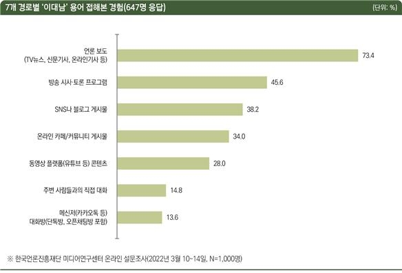 사전에 용어를 알았던 이들을 대상으로 접한 경로를 살펴본 결과 TV뉴스, 신문기사, 온라인기사 등의 ‘언론 보도’를 선택한 비율이 73.4%를 차지했다. 방송 시사·토론 프로그램(45.6%), SNS나 블로그 게시물(38.2%), 온라인 카페/커뮤니티 게시물(34.0%), 동영상 플랫폼(유튜브 등) 콘텐츠(28.0%), 주변 사람들과의 직접 대화(14.8%) 등으로 2위 이하 경로 모두 절반 이하 비율이란 점을 감안하면 압도적으로 높은 수치다.