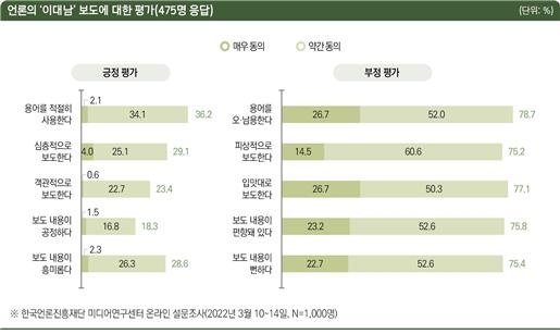 ‘언론 보도’를 통해 ‘이대남’ 용어를 접한 이들은 관련 보도를 부정적으로 평가하고 있었다. 긍정평가 항목에 동의하는 비율이 18.3%~36.2% 범위였던 데 반해 부정 평가 항목들에선 모두 70%대 중후반의 높은 비율이 확인됐다. 부정평가 중 “용어를 오·남용한다”가 78.7%, “피상적으로 보도한다” 75.2%, “입맛대로 보도한다” 77.1%, “보도내용이 편향돼 있다” 75.8%, “보도 내용이 뻔하다” 75.4% 등이었다.