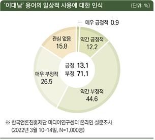 제20대 대통령 선거에서 주요 관심사로 부각됐던 용어 ‘이대남’(20대 남성)에 대해 국민 10명 중 8명은 “세대·성별 갈라치기 프레임”이라고 인식하는 것으로 나타났다. ‘이대남’을 들어본 적이 있다는 응답은 대략 3명 중 2명 꼴이었는데 ‘언론 보도’가 이를 접한 주요 경로로 꼽혔고 이들 보도에 대해선 부정 평가가 지배적이었다.