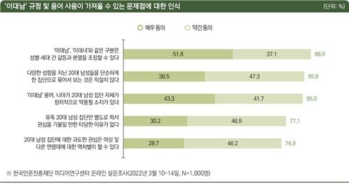 우리 사회에서 ‘이대남’ 용어를 일상적으로 사용하는 데 대한 인식을 물은 문항에선 부정 인식이 압도적으로로 높은 비율을 보였다. 긍정 인식은 ‘매우 긍정’ 0.9%, ‘약간 긍정’ 12.2%로 총 13.1%였던 데 반해 부정 인식은 ‘매우 부정’ 26.5%, ‘약간 부정’ 44.6%로 71.1%에 달했다. 용어 사용이 가져올 수 있는 문제점으론 “이대남, 이대녀와 같은 구분은 성별·세대 간 갈등과 분열을 조장할 수 있다”(88.9%, ‘매우 동의’ 51.8%)가 가장 높은 동의 비율을 보였다. “다양한 성향을 지닌 20대 남성들을 단순하게 한 집단으로 묶어서 보는 것은 적절치 않다”(85.8%), “이대남 용어, 나아가 20대 남성 집단 자체가 정치적으로 악용될 소지가 있다”(85.0%)가 뒤를 이었다.