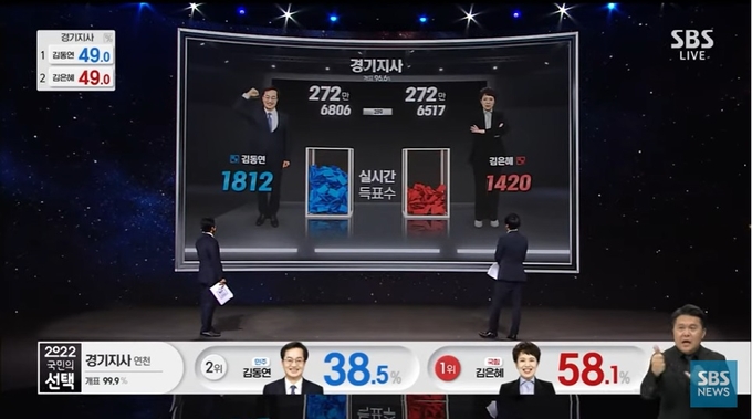 그러나 일출(2일 기준 오전 5시11분) 후에도 당선자 윤곽은 좀처럼 나오지 않았다. 자정을 넘어서며 김은혜 후보를 맹추격하기 시작한 김동연 후보는 개표 후반 사전투표함이 열리면서 본격적으로 표차를 크게 좁혀가기 시작했다. 결국, 개표율 96.6%, 오전 5시32분이 지나서야 ‘골든크로스’가 일어났다. 이후로 김동연 후보는 표차를 계속 벌려가며 당선을 거머쥐었다. KBS는 개표율 99.2% 상황인 오전 6시45분에야 김동연 후보의 당선이 ‘유력’하다고 밝혔다. 이에 앞서 KBS는 10초 단위로 경기지사 개표 상황을 ‘새로고침’했고, SBS는 1시간 넘게 경기지사 후보 실시간 득표수만을 집중해서 중계했다.