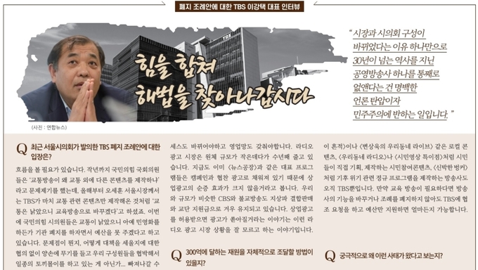 300억원에 달하는 재원을 자체적으로 조달하기도 사실상 어렵다고 했다. 이 대표는 “TBS는 서울시 출자·출연 기관이라 수익 사업에 제약이 따른다. 후원회원을 모집하려 해도 서울시와 서울시의회가 동의를 해줘야 한다. 서울시의 지원을 받아왔다고 KBS, EBS, 아리랑방송이 받는 방송발전기금 대상에서도 제외되어있다. 법적인 지위도 지역방송이 아닌 까닭에 정부 지원금조차 받을 수 없다”고 말했다. 그러면서 “TBS가 제작하는 콘텐츠는 명백하게 공적 역할을 수행하고 있는 만큼 공공 부문의 재원이 조달되어야 한다”고 주장했다.