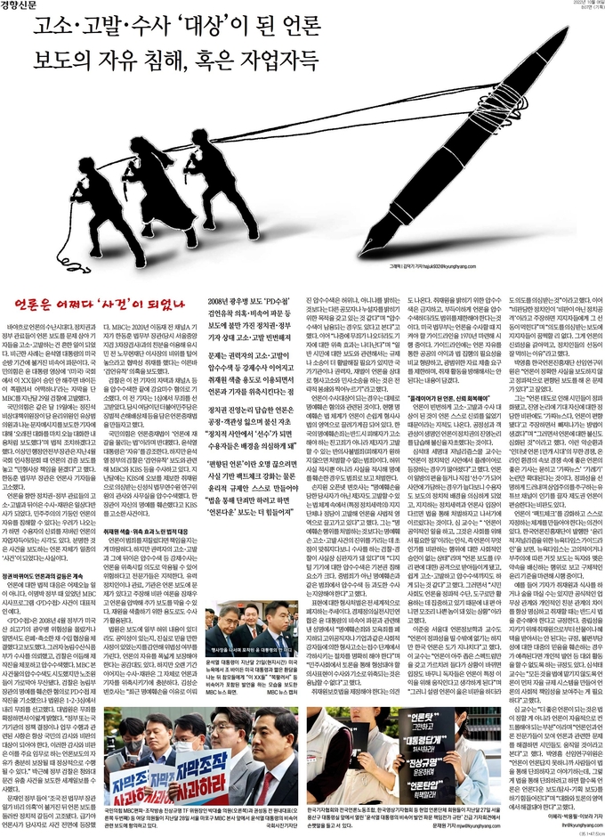 경향은 또 7면에 ‘언론은 어쩌다 ‘사건’이 되었나’란 제하의 기사(기사 보기: 고소·고발·수사 ‘대상’이 된 언론…보도의 자유 침해, 혹은 자업자득)를 싣고 “언론을 향한 정치권·정부 관료들의 고소·고발과 뒤이은 수사·재판은 일상다반사가 되었다”면서 “분명한 것은 사건을 보도하는 언론 자체가 일종의 ‘사건’이 되었다는 사실”이라고 보도했다.