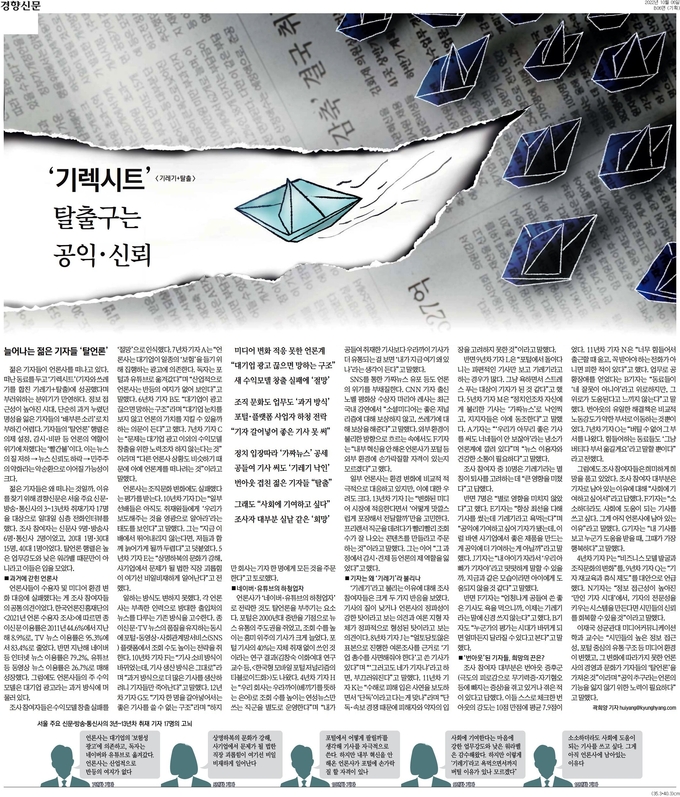 경향신문이 창간 76주년 기획으로 기자들의 ‘탈언론’ 행렬을 다뤄 눈길을 끈다. 경향신문은 지난 6일 창간기획으로 별지 6~7면 두 개 면을 털어 ‘기렉시트(기자와 쓰레기를 합친 기레기+엑시트(탈출))’와 언론에 대한 고소·고발 문제를 다뤘다. 젊은 기자들이 언론사를 떠나는 문제는 최근 2~3년 사이 본지를 포함한 미디어 전문지들이 주요 이슈로 다뤄왔으나, 주요 언론사에서 ‘직접’ 이 문제를 정면으로 다룬 적은 거의 없었다. (기사 보기: ‘기렉시트(기레기+탈출)’ 탈출구는 공익·신뢰)