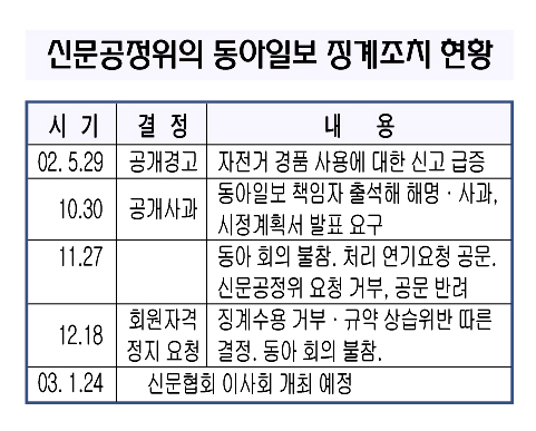 신문공정위는 이날 회의에서 동아일보가 신문공정경쟁규약을 상습적으로 위반하고 이에 따른 징계조치를 수용하지 않았다는 이유로 이같이 결정했었다. 동아일보에 대한 신문공정위 조치는 그동안 규약 위반→징계→징계수용 거부·추가 위반→추가 징계 등의 양상을 되풀이해왔다.