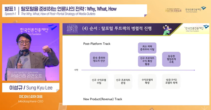또한, ‘탈포털’과 ‘신규 수익모델 수립’ 전략은 반드시 병렬적으로 진행돼야 한다. 이 대표는 “신규 수익모델을 만들고 거기에 따른 새로운 프로덕트를 론칭을 시킨 뒤 그 수익모델이 확장되는 시점에 가장 최소 피해 규모가 되는 층위부터 플랫폼에서 서서히 빠져나올 때 실제로 피해 규모가 최소화될 수 있고 플랫폼을 어떻게 활용할까에 대한 전략으로 넘어갈 수 있다”면서 “탈포털만 생각하고 새로운 수익모델을 간과하는 한 아무것도 성과를 못 내고 훨씬 더 종속의 정도가 커질 수 있다는 점을 염두에 둘 필요가 있다”고 밝혔다.