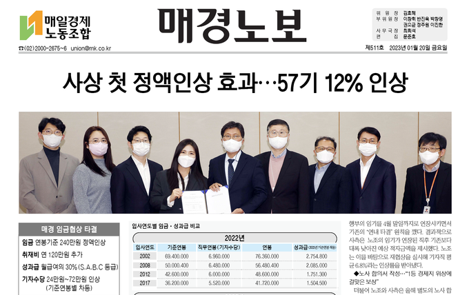 매일경제신문 노사가 연봉 기준 240만원 정액 인상 등을 포함한 ‘2022년 임금협약’을 지난 18일 체결했다. 정률 방식이 아닌 정액 방식으로 임금을 인상한 건 이번이 처음이다.