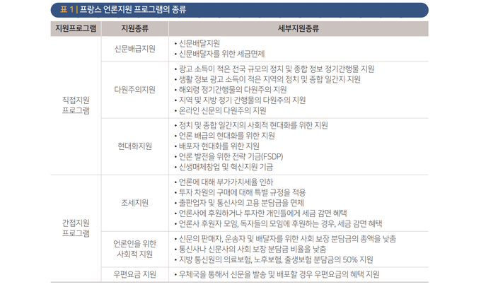 언론재단은 보고서에서 “프랑스 정부는 언론사 지원 신청 자격 조건으로 ‘전문직 기자의 존재’와 ‘광고와 기사의 명확한 구분’을 언론의 상업화에 대한 일종의 제동장치로 도입한 것”이라고 평가했다. 지난해 2월 언론 독립성 강화 법안에 따라 지원을 받는 언론사는 매출의 최소 35%를 인건비에 투자해야 하며, 언론인이 전체 구성원의 절반 이상을 차지해야 한다는 조건도 충족해야 하는 상태다.