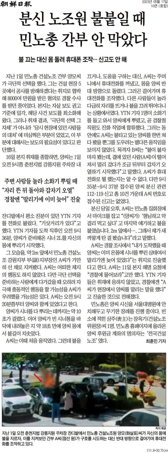 언론노조와 건설노조는 17일 오전 서울 중구 한국프레스센터 18층 언론노조 회의실에서 긴급 기자회견을 열어 지난 16~17일 조선닷컴과 조선일보 지면에 게재된 보도에 대해 반박했다. 조선일보는 '양 지대장이 지난 1일 노동절에 분신할 당시 현장에 있던 노조 간부 A씨가 말리지 않았다'는 취지의 보도를 CCTV 영상, 목격자 진술 등을 근거로 내놨다. 이에 대해 김준태 건설노조 교육선전국장은 “A씨는 열사의 분신을 말리려 했다. 양희동 열사는 목격자와 조우하기 전 이미 휘발성 물질을 자신의 몸과 주변에 뿌린 상황이었고 조우 당시엔 한 손에 라이터를, 다른 한 손엔 또 다른 휘발성 물질을 들고 있었다”며 “다가오지 말라는 경고에 따라 A씨는 섣부르게 접근할 수 없었고, 불의의 사고에 대비해 대화로 설득할 수밖에 없었던 상황”이라고 설명했다.