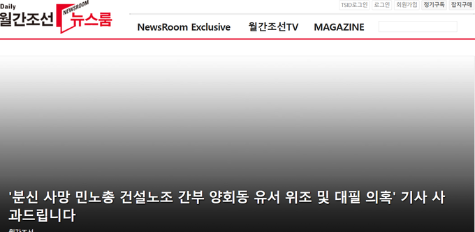 월간조선은 이날 홈페이지에 올린 <‘분신 사망 민노총 건설노조 간부 양회동 유서 위조 및 대필 의혹’ 기사 사과드립니다>라는 제목의 글에서 “해당 기사의 취재 및 출고 경위를 조사했고 중대한 결함이 있었음을 확인했다”고 밝혔다.