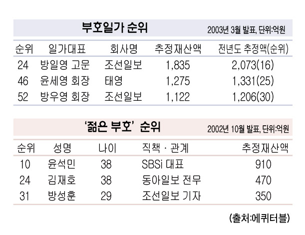 방일영 조선일보 고문일가의 경우 추정 재산액 1835억원으로 언론계에서는 최고인 24위를 기록했으며, SBS 회장을 맡고 있는 윤세영 태영 회장 일가가 1275억원(46위)으로 뒤를 이었다. 방우영 조선일보 회장 일가의 추정 재산액은 1122억원(52위)으로 나타났다. 지난해 4월 발표된 자료에 따르면, 방일영 고문일가와 윤세영 회장 일가는 추정 재산액 2073억원(16위) 1331억원(25위)을 기록, 올 들어 각각 238억원, 56억원이 줄어든 것으로 집계됐다. 방우영 회장 일가는 1206억원(30위)을 기록했다.
