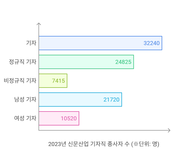 성별 구성에선 남성 기자(2만1720명)가 여성 기자(1만520명)보다 두 배가량 많았다. 직무별로는 편집기자가 가장 많았고 그 뒤를 취재기자, 논설위원, 사진/동영상, 온라인(SNS) 기자 등이 따랐다. 편집기자가 취재기자보다 많은 것은 인터넷 신문의 경우 편집기자 비율이 월등히 높아서인데, 이는 인터넷 신문사들이 자사 기사 및 외부 기사제휴업체의 기사를 수정하거나 재배치하는 데 많은 인력을 쓰고 있기 때문이다.
