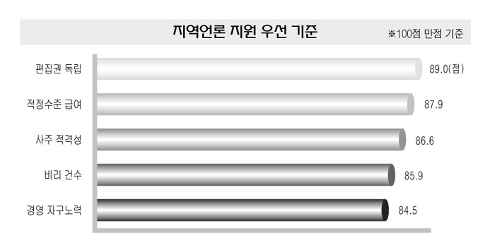 월간 <신문과 방송>이 지난달 1일과 2일 전국 30개 지방신문 편집국장을 대상으로 실시한 설문조사 결과, 편집국장들은 지원대상 신문 선정시 고려해야 할 22개 항목 가운데 가장 중요한 기준으로 100점 만점에 89.0점(전혀 중요하지 않으면 0점, 매우 중요하면 10점으로 각 항목의 평균을 측정한 후 100점 만점으로 환산)을 얻은 ‘편집권 독립 장치 마련과 이행’을 꼽았다.